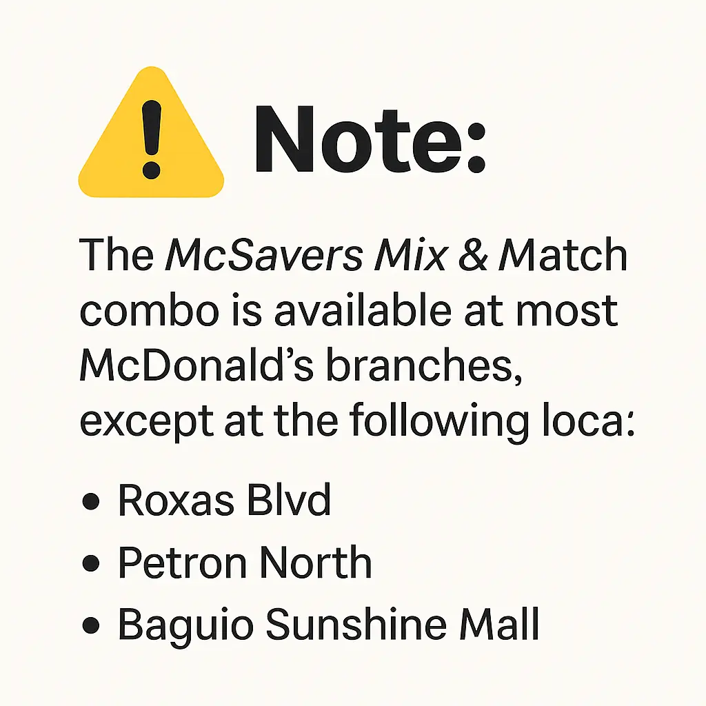 The McSavers Mix & Match menu is available daily from 10:00 AM to 3:59 AM for Dine-In, Take-Out, Self-Order Kiosks, and Drive-Thru, but it cannot be ordered through McDelivery, Grab, FoodPanda, or Fries Kiosks.
